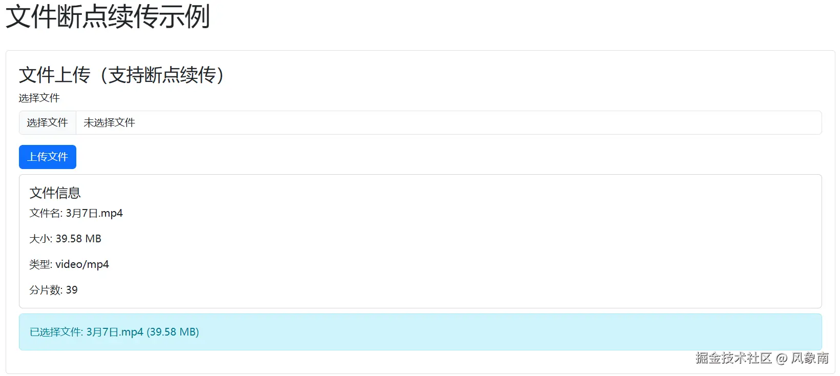 文件分片:使用Resumable.js将大文件分割成多个小块(默认1MB),每块单独上传