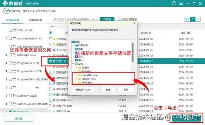 步骤2:软件的扫描工作结束后,我们可以在软件的中间位置选择需要恢复的文件,点击【导出】后,在弹窗中选择另一个存储位置存放恢复文件,单击【确定】。