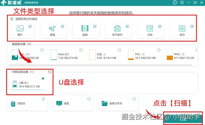 步骤1:打开数据 蛙恢复专家,进入主页面后在上面选择丢失的U盘文件类型,点击U盘作为扫描对象,点击【扫描】;