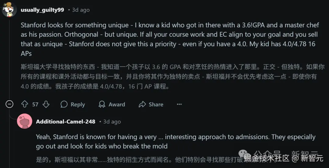 网友举例称,一个以 GPA 3.6 分进入斯坦福的孩子,他的核心竞争力是对烹饪的狂热。但若是你所有的课程和课外活动都与之目标一致,5 并将其作为独特的卖点,即便是你拿下了 4.0 满分,斯坦福也不会考虑。
