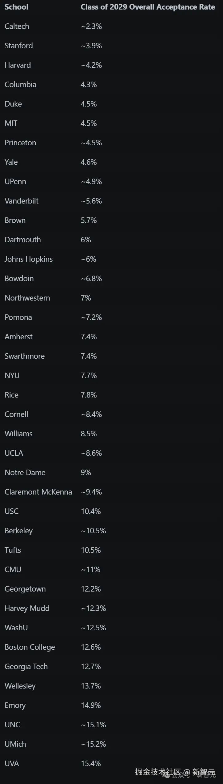 有网友统计了 2029 届常春藤名校录取率,如下图所示。