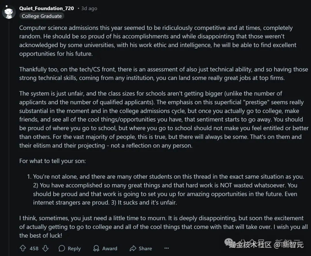 父亲希望通过这个帖子,能找到激励孩子的方法。针对美国高校 CS 招生残酷事实,更在全网引发了激烈的讨论。