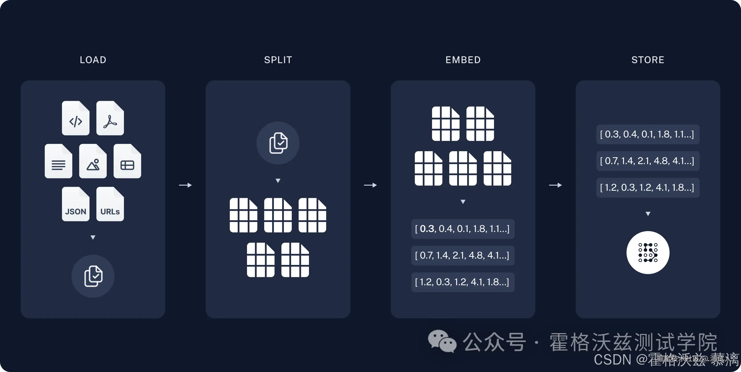 3、向量存储:这一步,利用使用VectorStore和Embeddings模型来完成将切片数据进行存储和索引,以供后续的检索使用