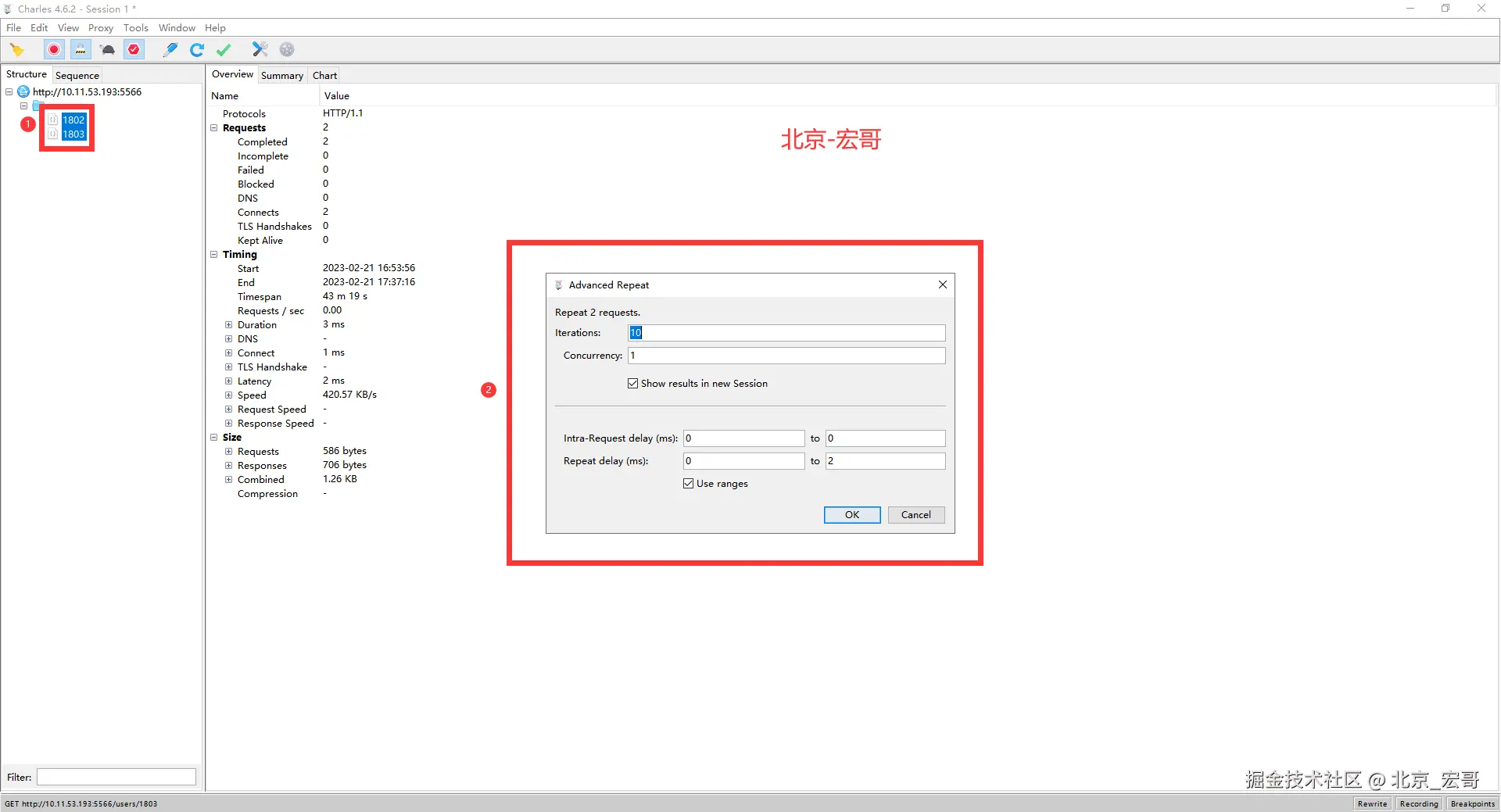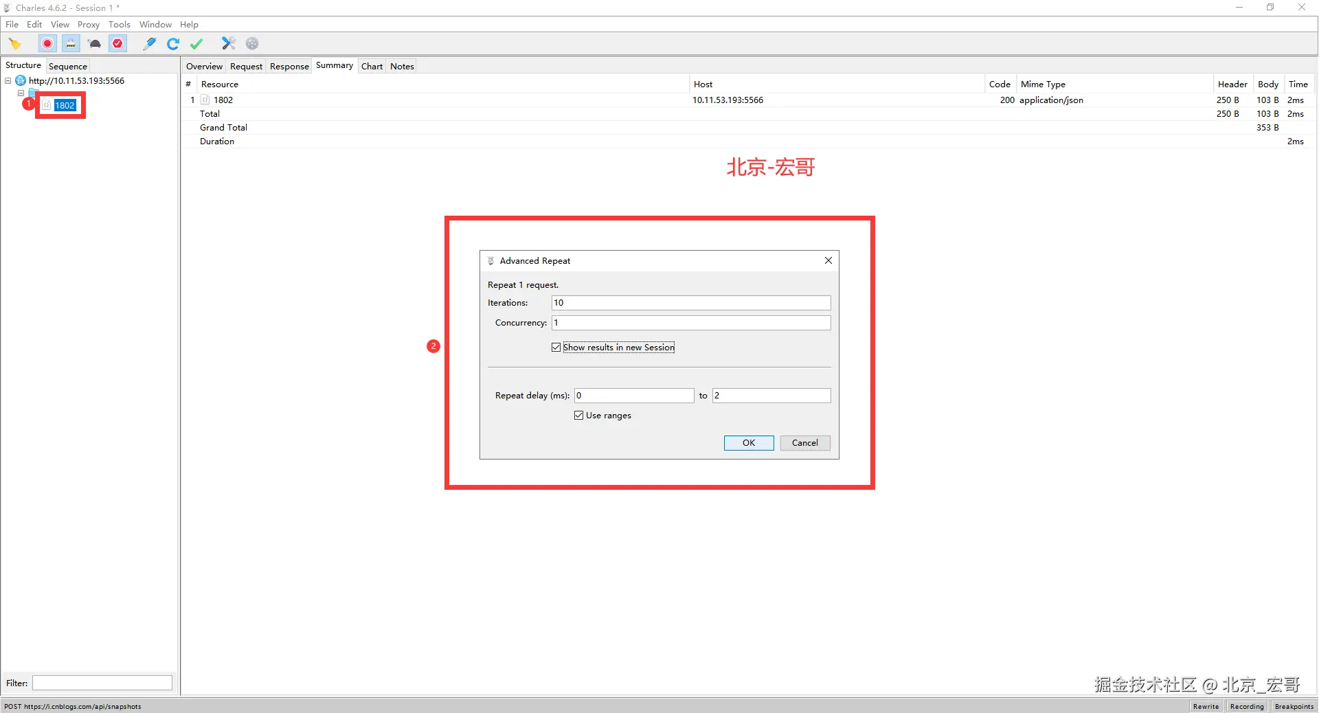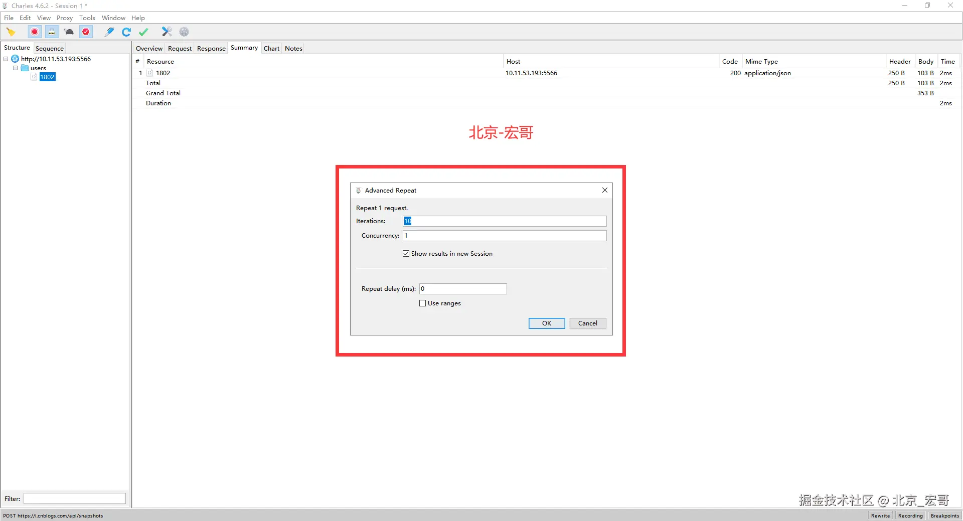 Advanced Repeat可以自定义重复次数和重复间隔,重复发送多次请求。可以来简单地测试服务器的并发处理能力,方法如下:我们在想打压的网络请求上(POST或 GET 请求均可)右击,然后选择 「Repeat Advanced」菜单项。然后在弹出的对话框中,选择打压的并发线程数以及打压次数,确定之后,即可开始打压。(iteration:迭代次数,Concurrency:并发数,repeat为时间间隔)。