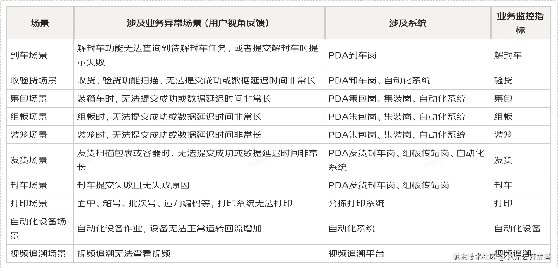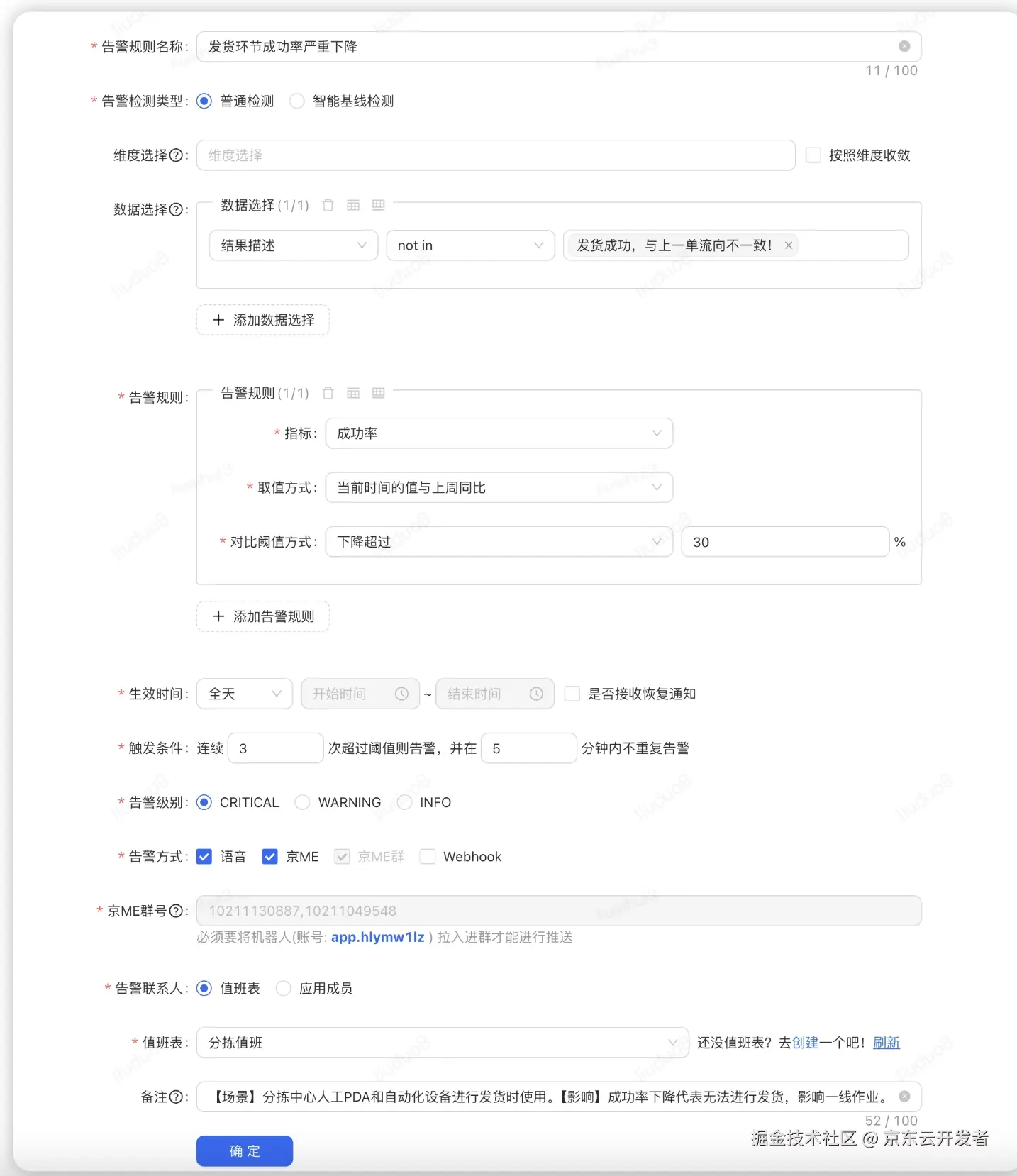 业务监控指标,是整个监控体系的“顶层”,能够直接反映用户使用业务的真实情况。在快递快运分拣业务域,体现如下(例如,发货环节,设置【发货环节成功率】作为监控指标,通过配置规则:当前时间的发货成功数据与上周同比下降超过30%,如果5分钟内连续出现3次告警,则触发严重级别的告警)。