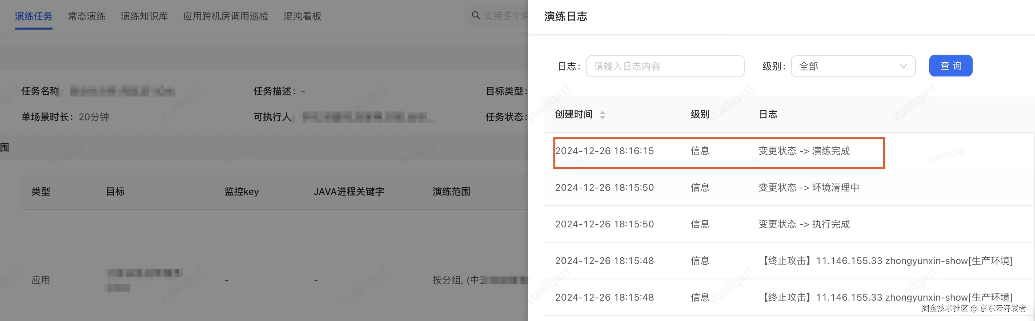 | 演练退出标准:故障注入超过5分钟未被识别、超过10分钟未被定位、超过15分钟未止损,对应场景终止故障注入,并完成环境初始化,标记演练未通过 |