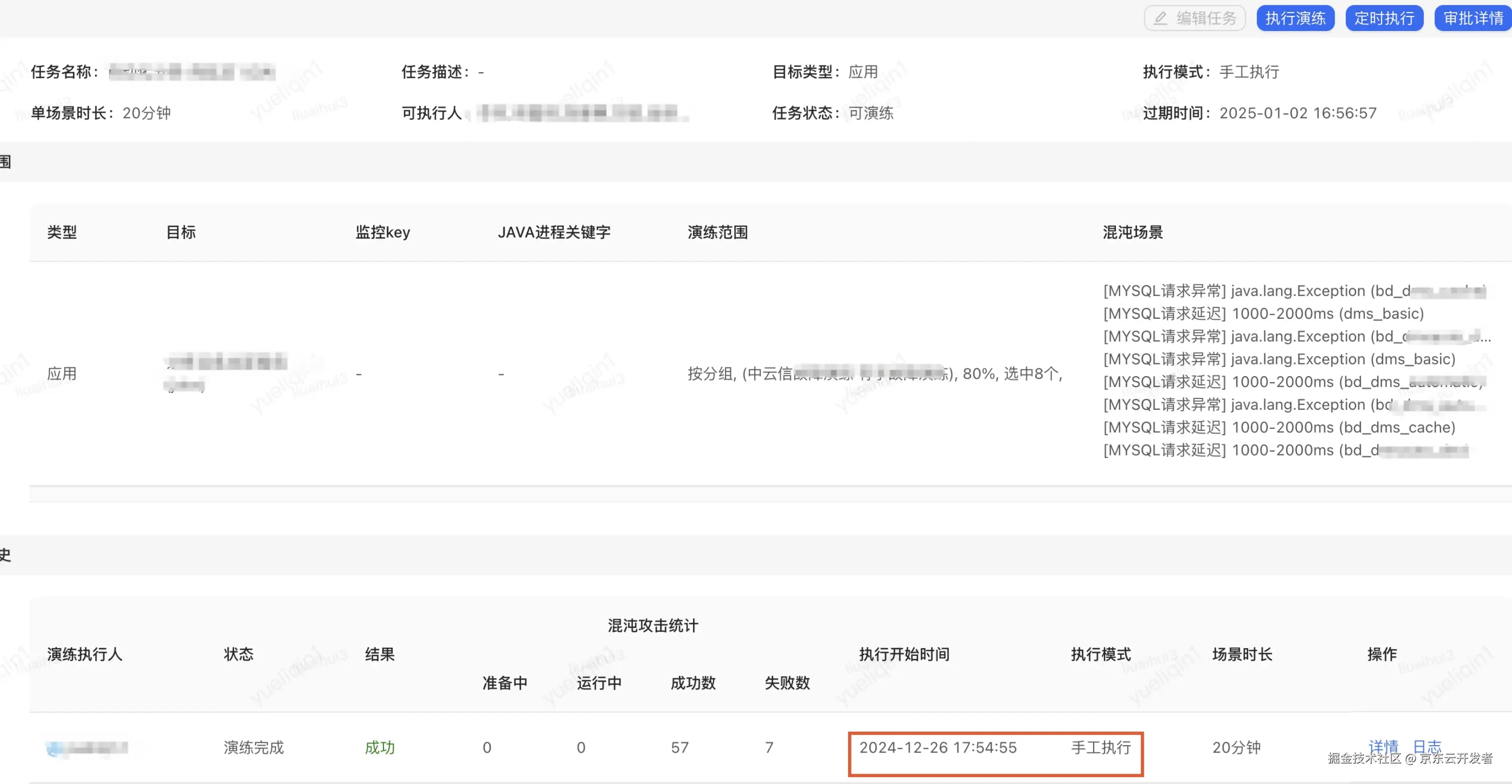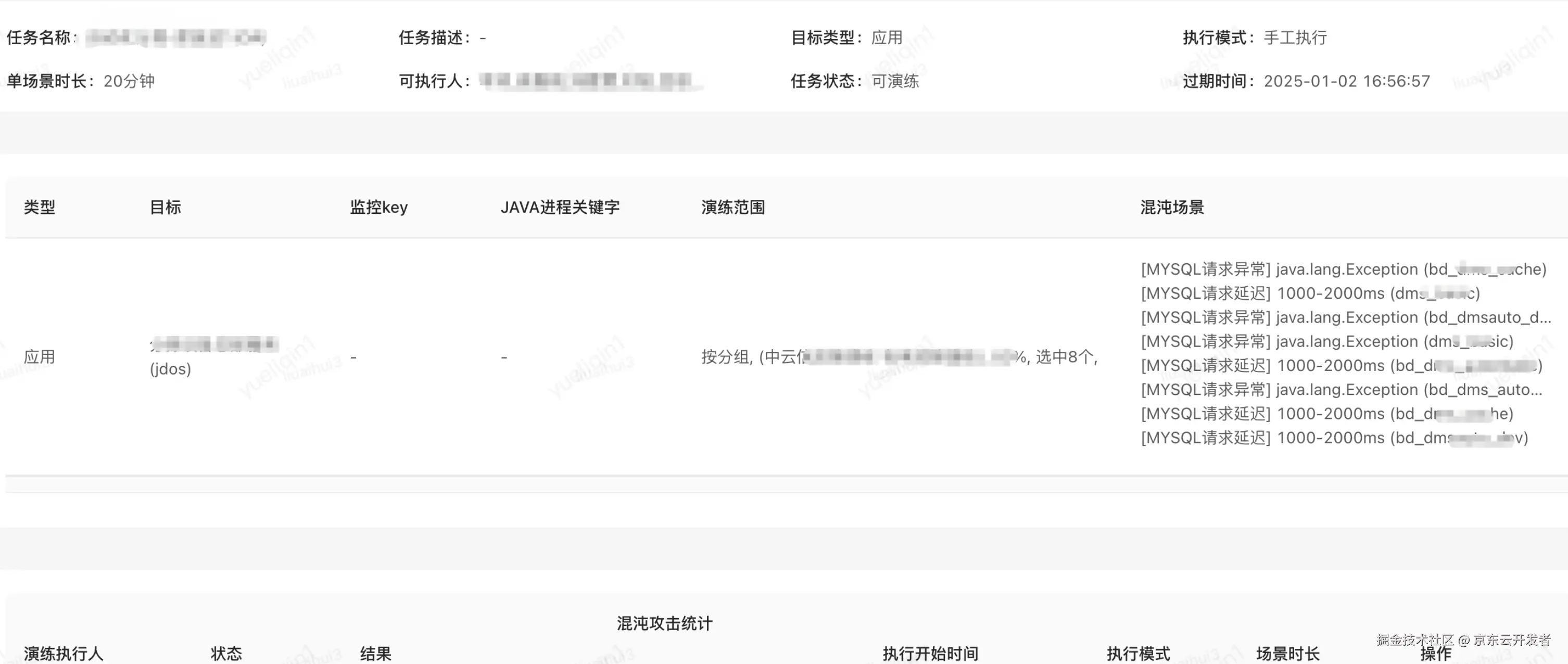 •场景描述:依据场景构建的基本原则,我们在构建数据库请求延迟的情况前提下,向系统注入带有异常业务数据的流量,以检查应急预案对应的处理能力。