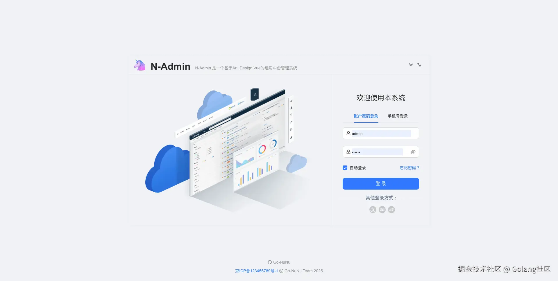 N-Admin 是一个免费的基于 Go (Gin + GORM + Casbin) 和 Vue3 (Ant Design Vue) 的全栈后台管理系统模板,提供完整的菜单管理、API权限控制等功能,帮助开发者快速构建安全可靠的管理系统。