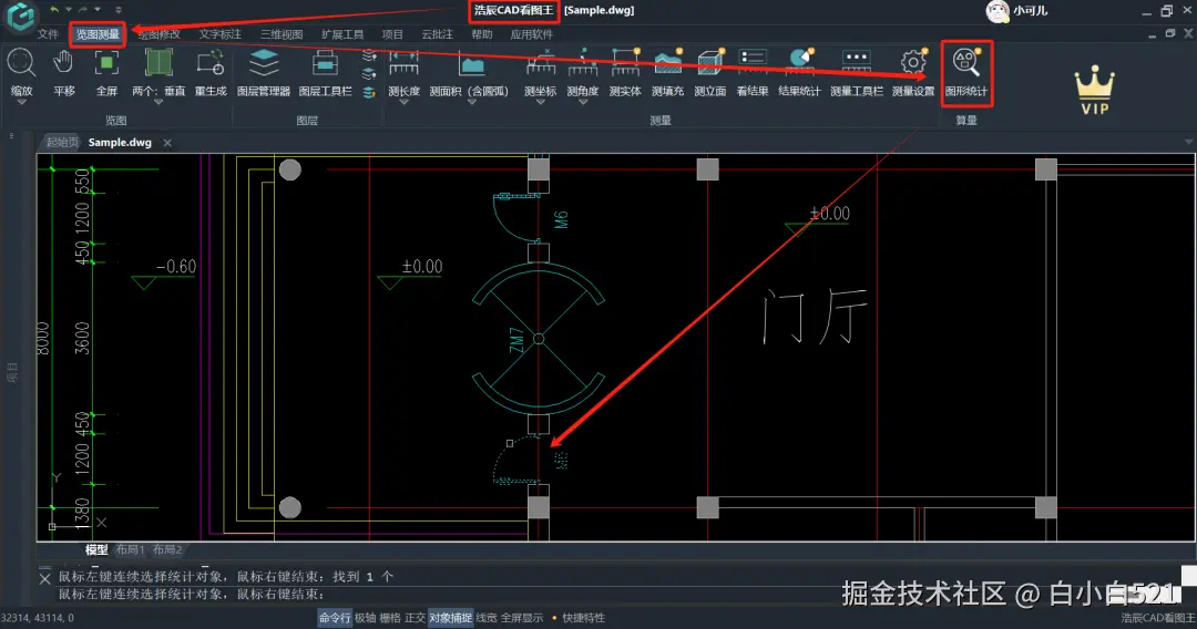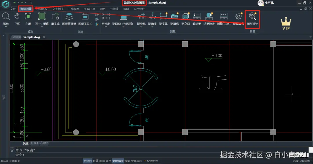 1、如下图所示,我们需要统计处图中统计型号)门的数量,就可以直接在浩辰CAD看图王览图测量菜单栏点击算量中的图形统计功能;