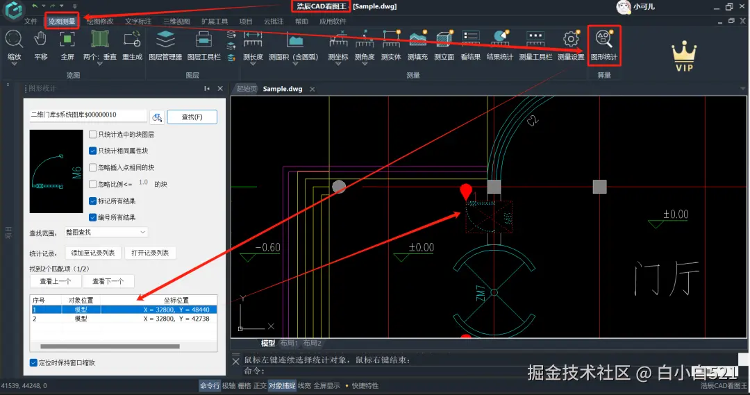 4、因为我们刚才已经选择了查找的对象是门(M6),所以只需要点击查找,就可以找到图纸中该型号(M6)门的数量以及对应的坐标位置。