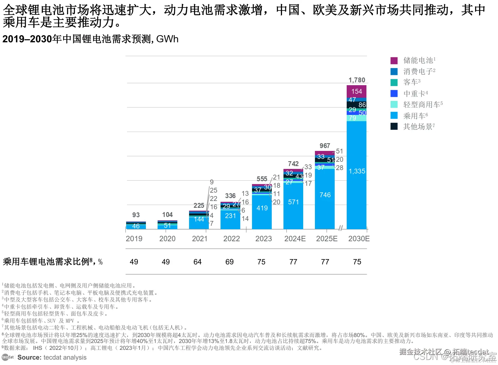 在全球能源市场大环境下,锂电池市场也备受关注。全球锂电池市场预计将迅猛扩展,年增速达25%,预计到2030年市场规模将超过4太瓦时。电动汽车的普及和长续航需求推动了动力电池需求的急剧增长,预计将占据80%的市场份额。