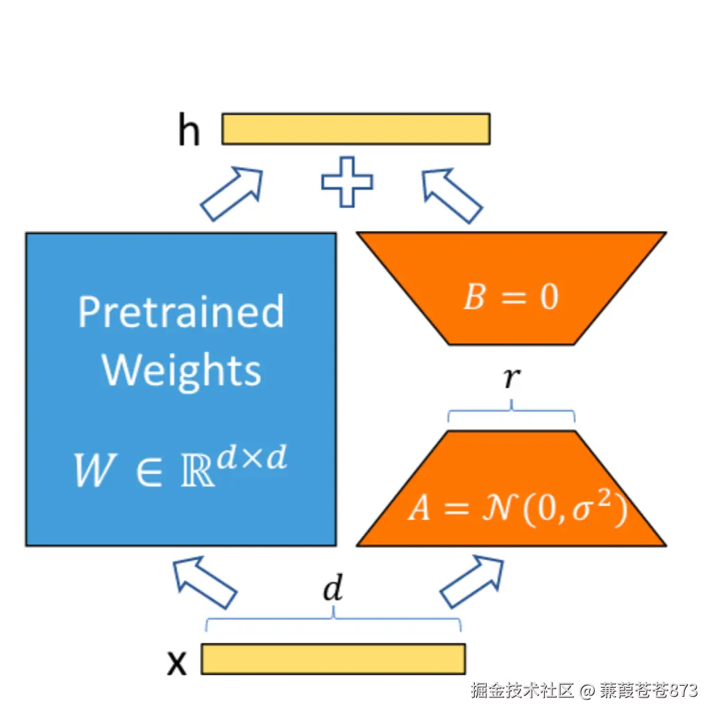 我们想要得到h, 原始模型输出为:h = Wx,引入低秩调整后:h = Wx + B*Ax,