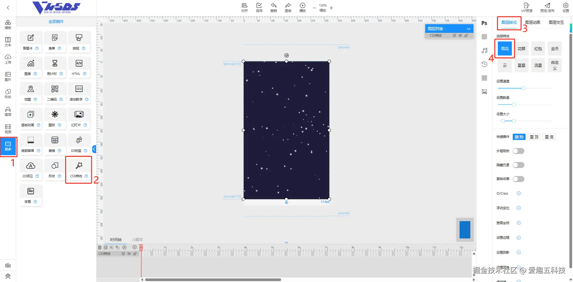 1.给背景添加适应的颜色,点击“更多”→“css特效”→“图层样式”,将默认的特效换成“雪花”即可