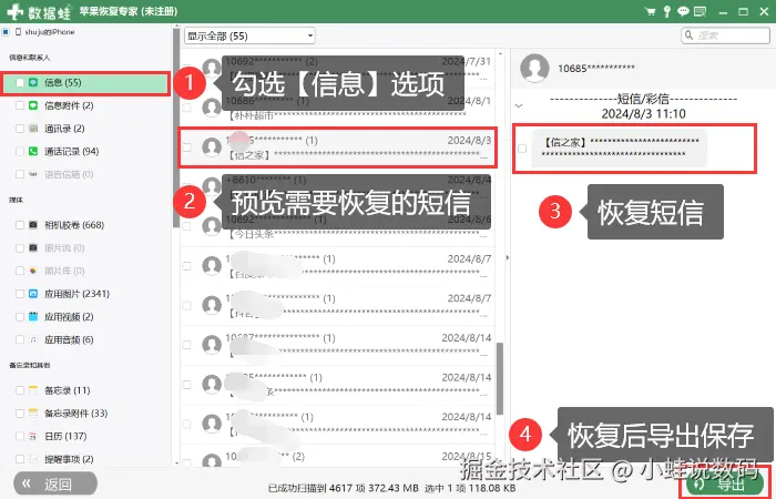 对于没有备份或备份不完整的情况,我们可以借助专业的数据恢复软件进行短信恢复。专业软件通常能够扫描手机存储,找到被删除的短信并尝试恢复。以下是使用【数据蛙苹果恢复专家】软件的主要优点和操作步骤: