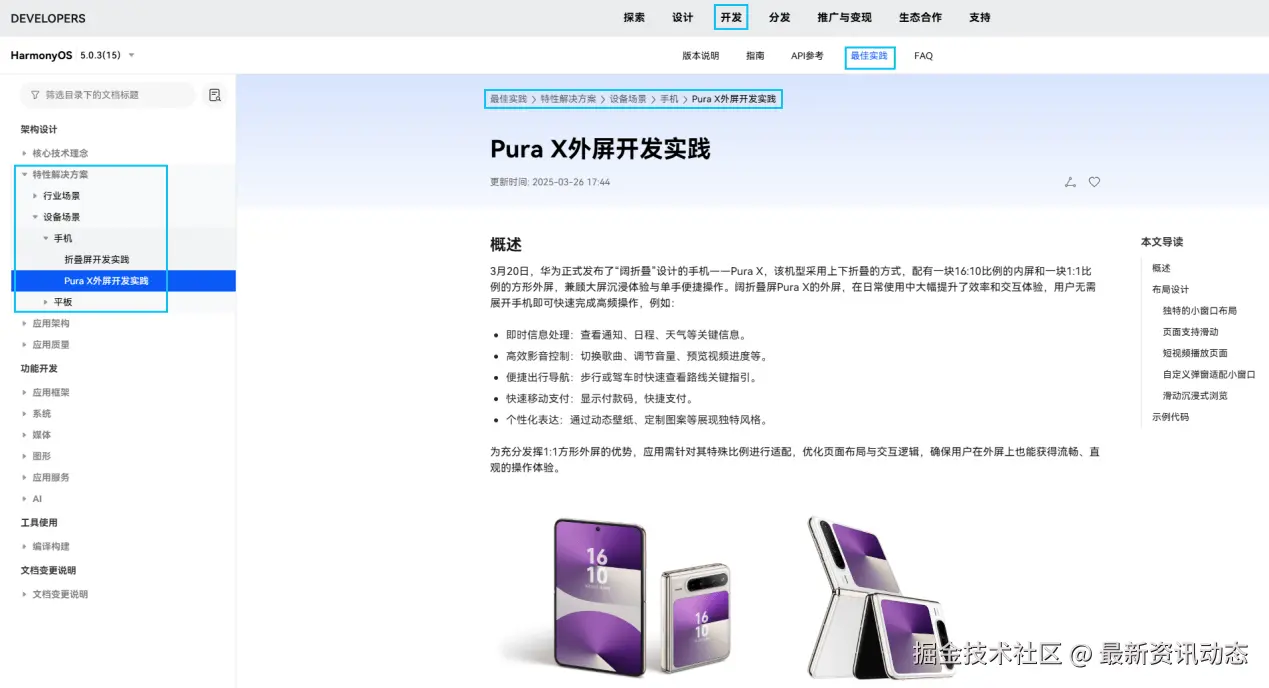最佳实践已上线华为HarmonyOS开发者官网,开发者可进入“HarmonyOS开发者官网”搜索《Pura X外屏开发实践》快速获取技术文档、示例代码及实战案例,快速打造优质的HarmonyOS一多应用。