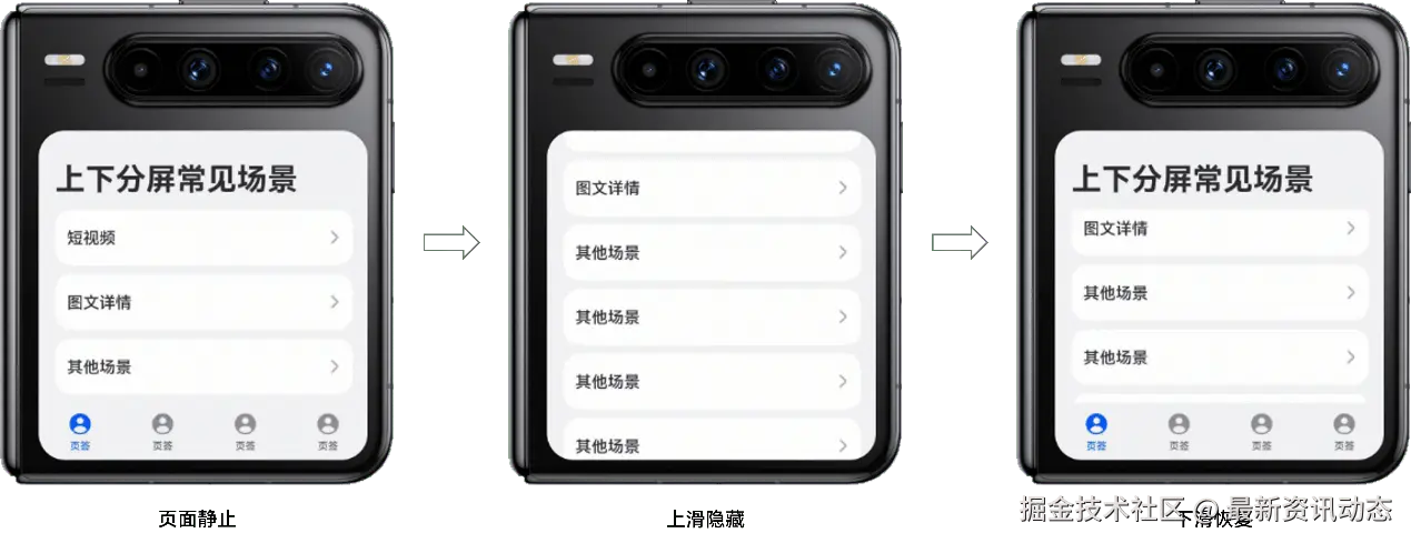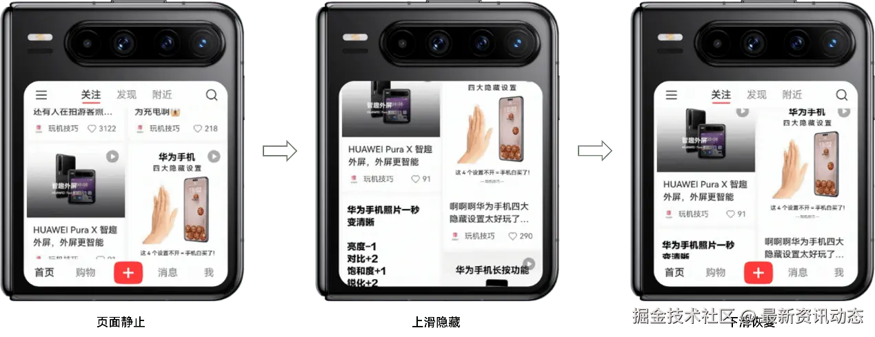 针对Pura X外屏显示特点,《Pura X外屏开发实践》提供了滑动沉浸式浏览的适配指导,该设计让用户更专注于内容本身,当用户向上滑动屏幕,可临时隐藏标题栏、页签栏等界面元素,实现全屏浏览;向下滑动时,页面元素通过动画效果重新显示,显著提升了外屏浏览效率。