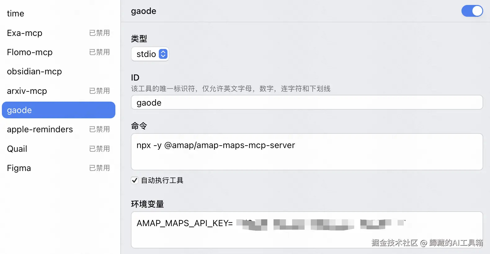 这个时候我们的 MCP 就配置好了,只需要点击右上角的开关就能启用,如果这个 MCP没有敏感风险的话,可以勾选自动执行工具,这样效率高点。
