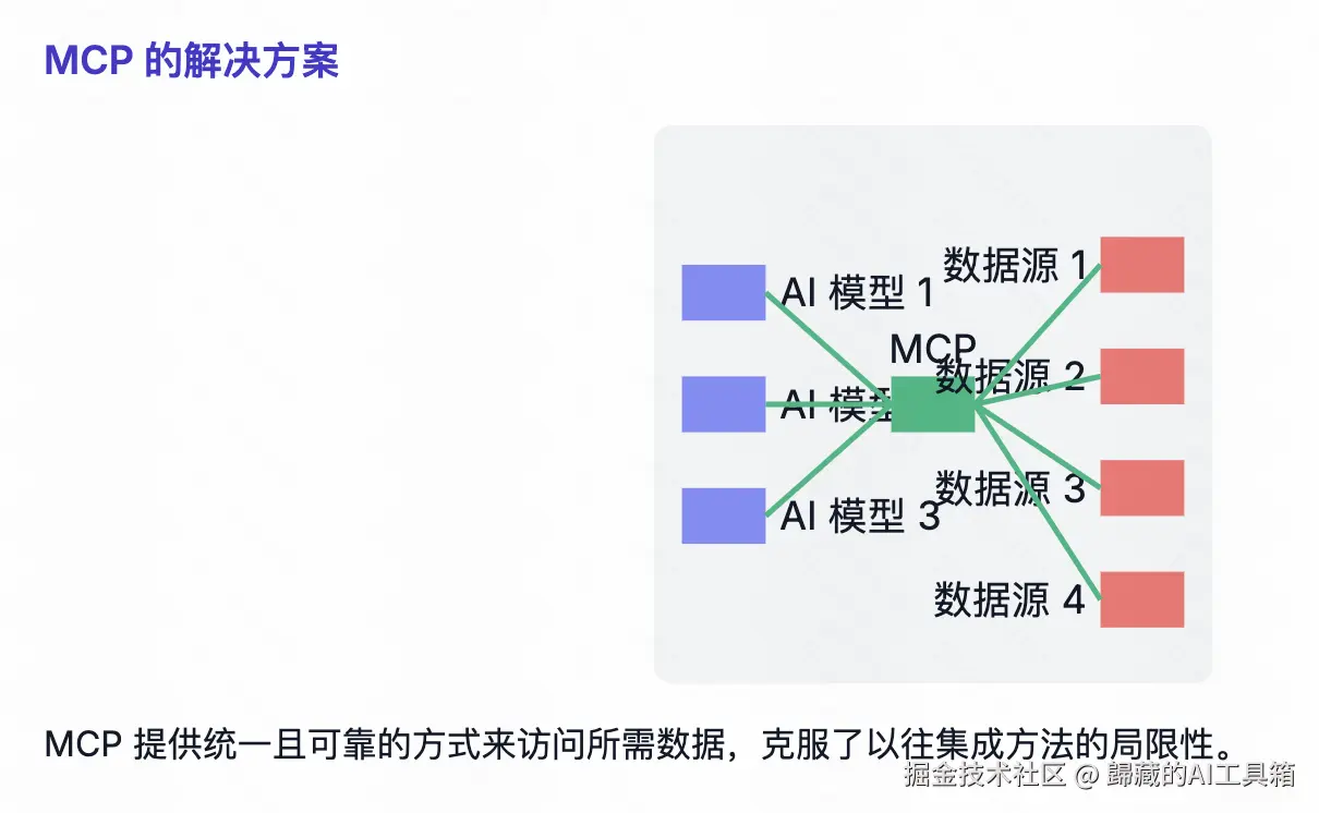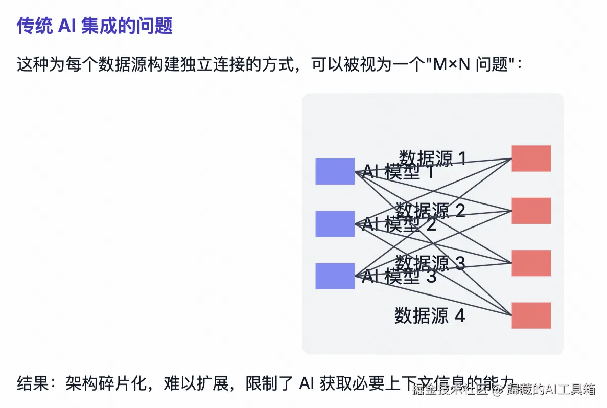 简单来说 LLM使用不同工具时,以前需要同时修改模型和工具,因为各工具的API数据格式不统一,导致适配成本高、功能添加慢。