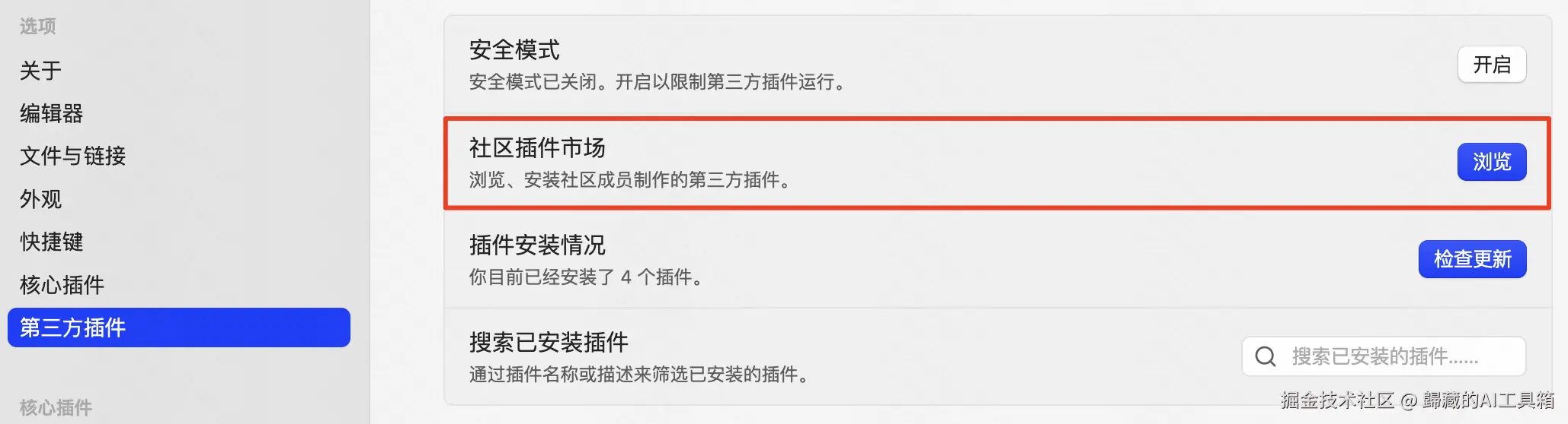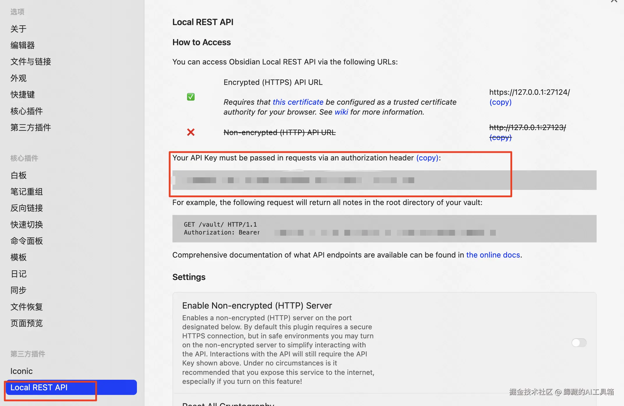 这里我们需要做个准备工作,先去 Obsidian 的「第三方插件」-「社区插件市场」找到 Loccal Rest API 这个插件安装并且启用/