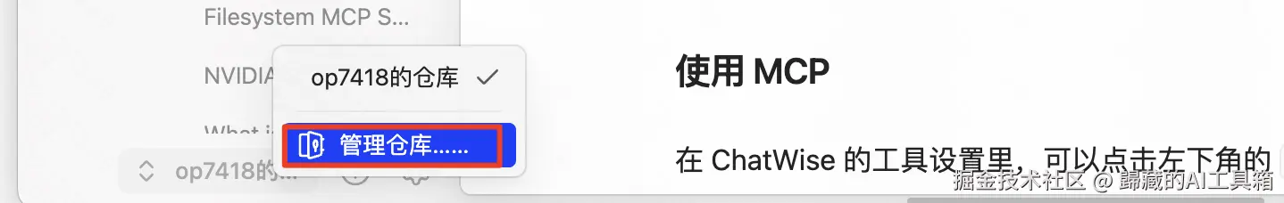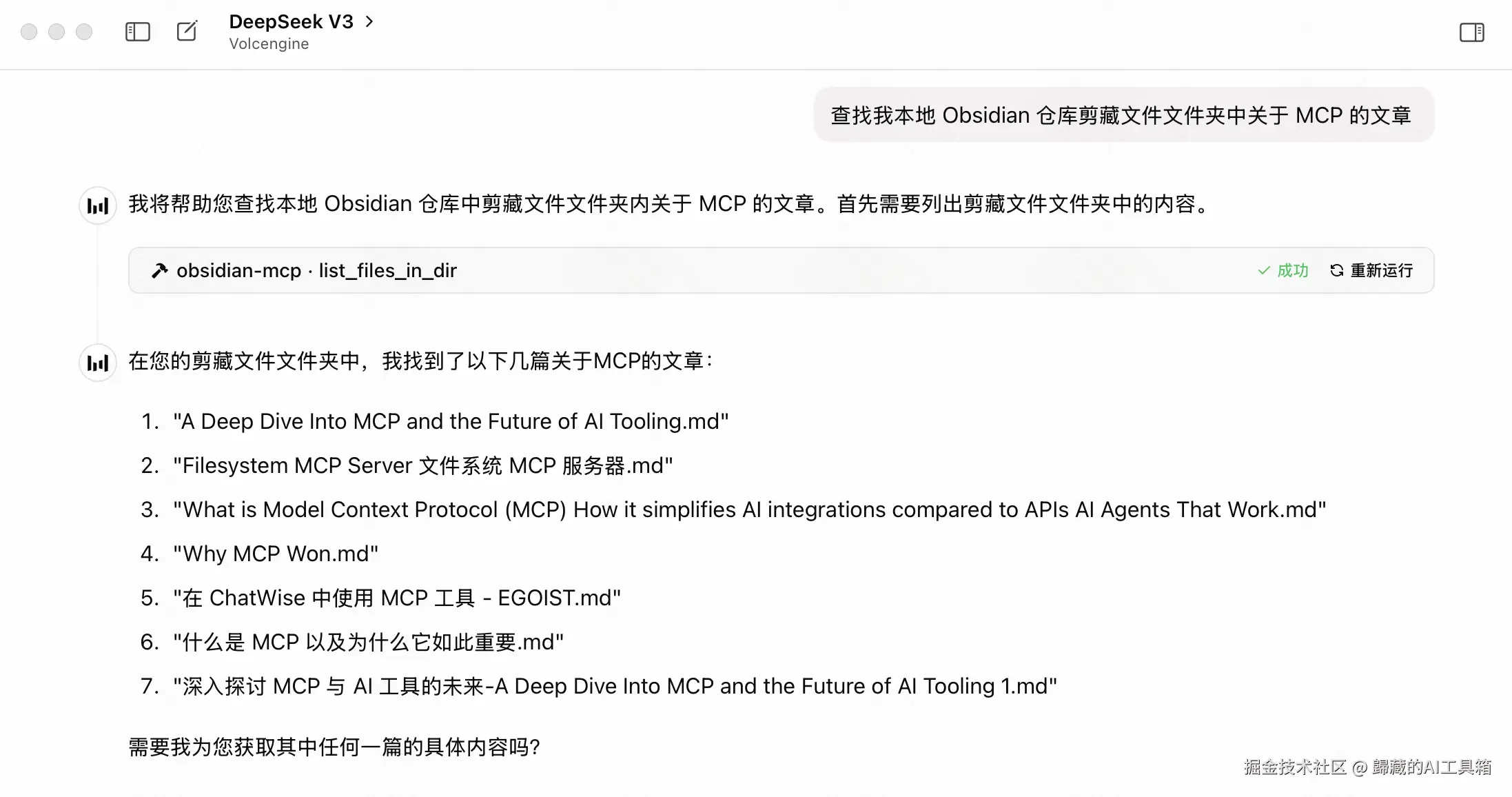 最后在 Chatwise 输入框启用 MCP 服务后就可以让任何 AI 模型检索你的内容了,比如我这里让他在指定文件夹查找关于 MCP 的文章,然后可以基于这些文章做 AI 知识库。