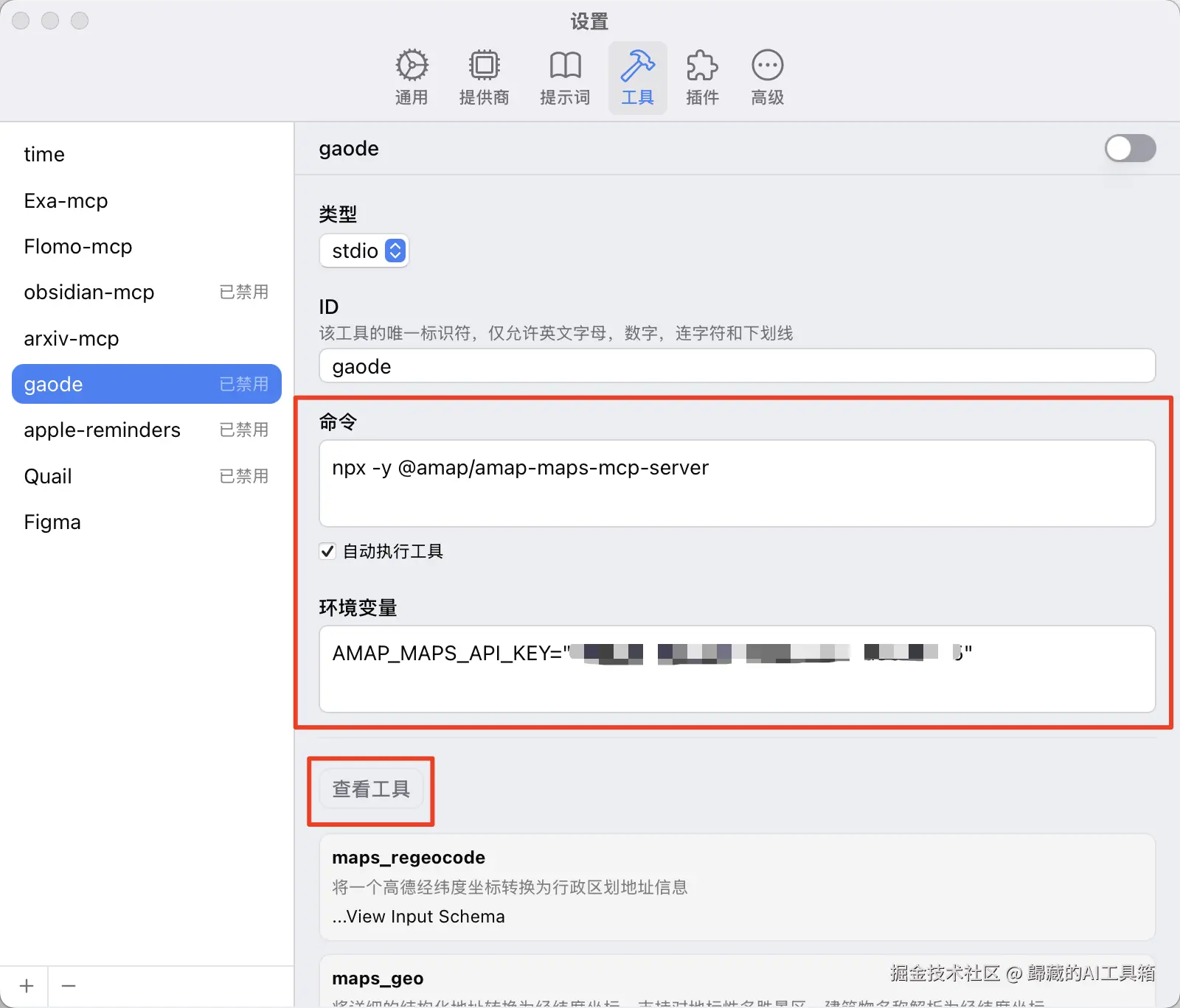 然后我们可以点击下面的查看工具按钮,如果调试没问题,就会列出具体的工具,如果调试有问题就会列出返回的报错,这时候我们就可以将报错发给 AI 看应该如何修复,一般是命令缺少参数或者环境变量的 API Key 填错了。