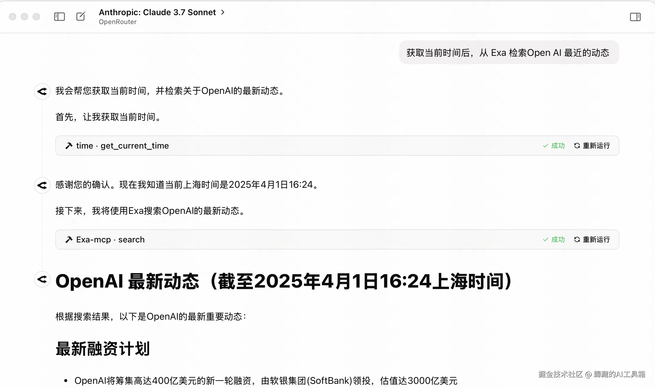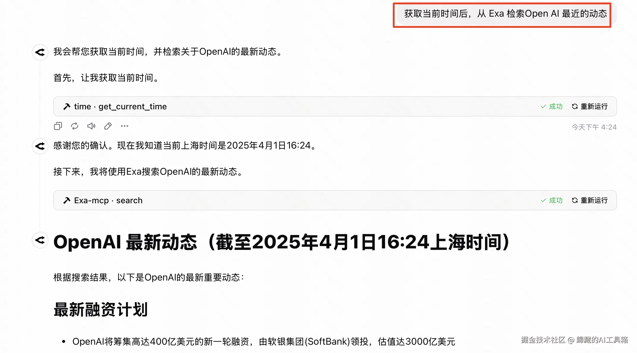 比如我下面这个问题他先调用时间 MCP 获取到了当前时间,然后调用 Exa 的搜索 MCP 搜索到了 Open AI最近的新闻。