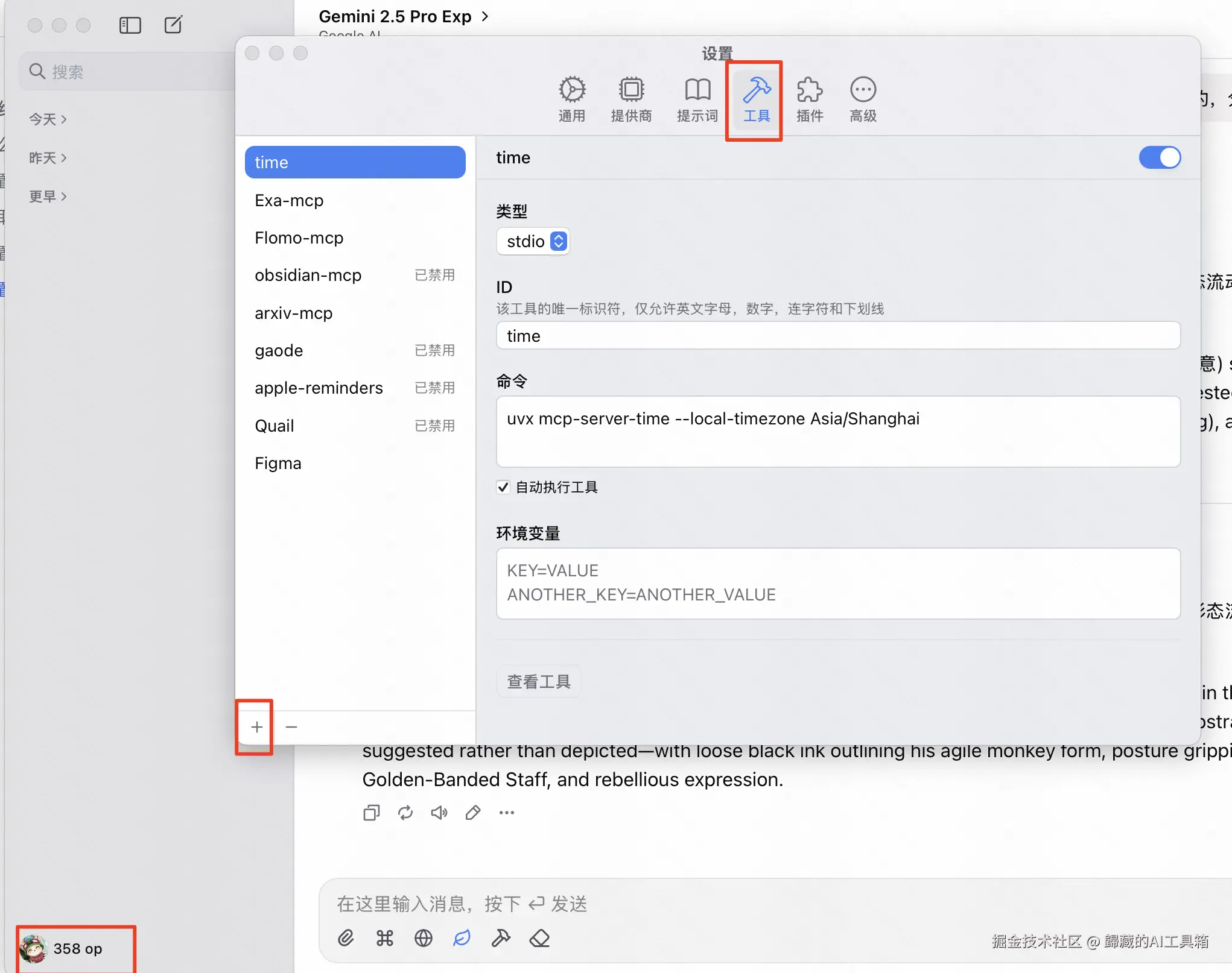 接下来就是使用了,ChatWise 可以在输入框点击锤子图标后开启来开启 MCP 服务的使用,需要注意的是,在开启开关后还需要单独点击需要启用的 MCP 服务,有了对号代表着启用了。