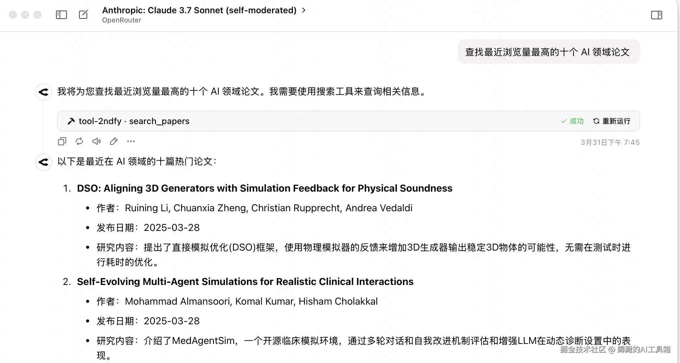 然后我们就可以愉快的检索和下载论文了,比如这里我们就让 MCP 从 arxiv 获取最近的 10 篇 AI 相关论文和介绍。