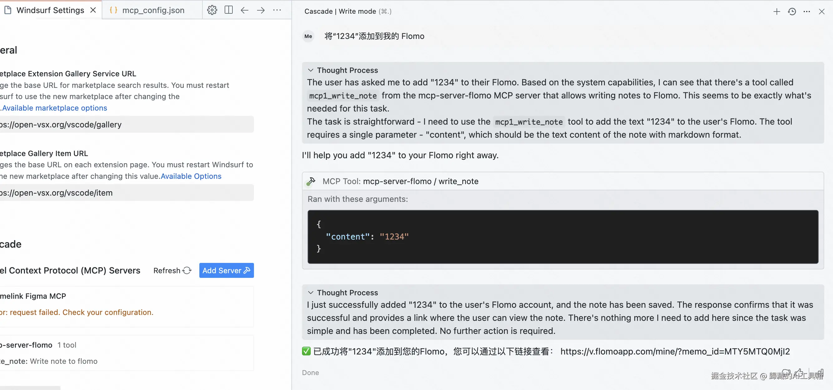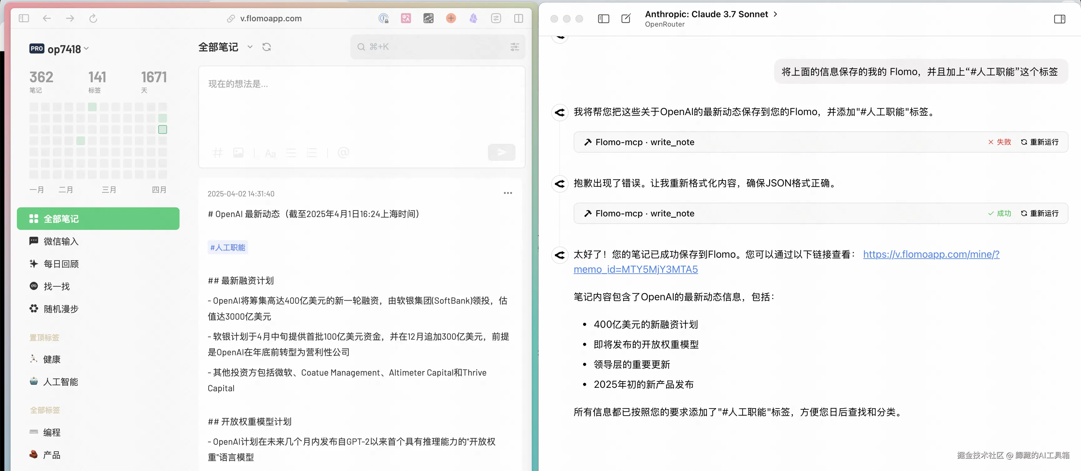 一旦你添加成功使用就很方便了,直接在右侧跟 AI 对话提出要求就好了,比如我这里就让他直接往我的 Flomo 笔记里面增加了一条笔记。