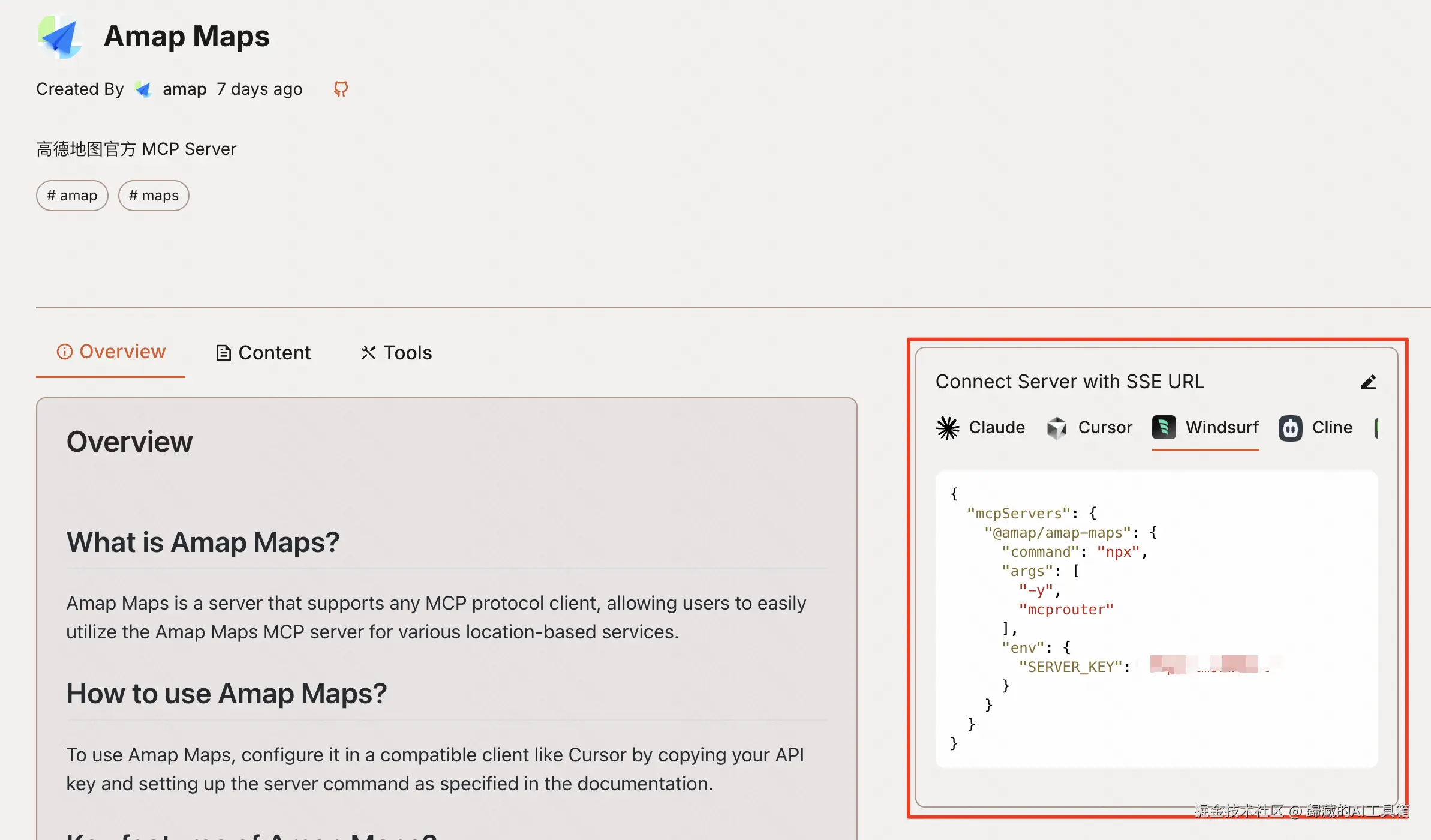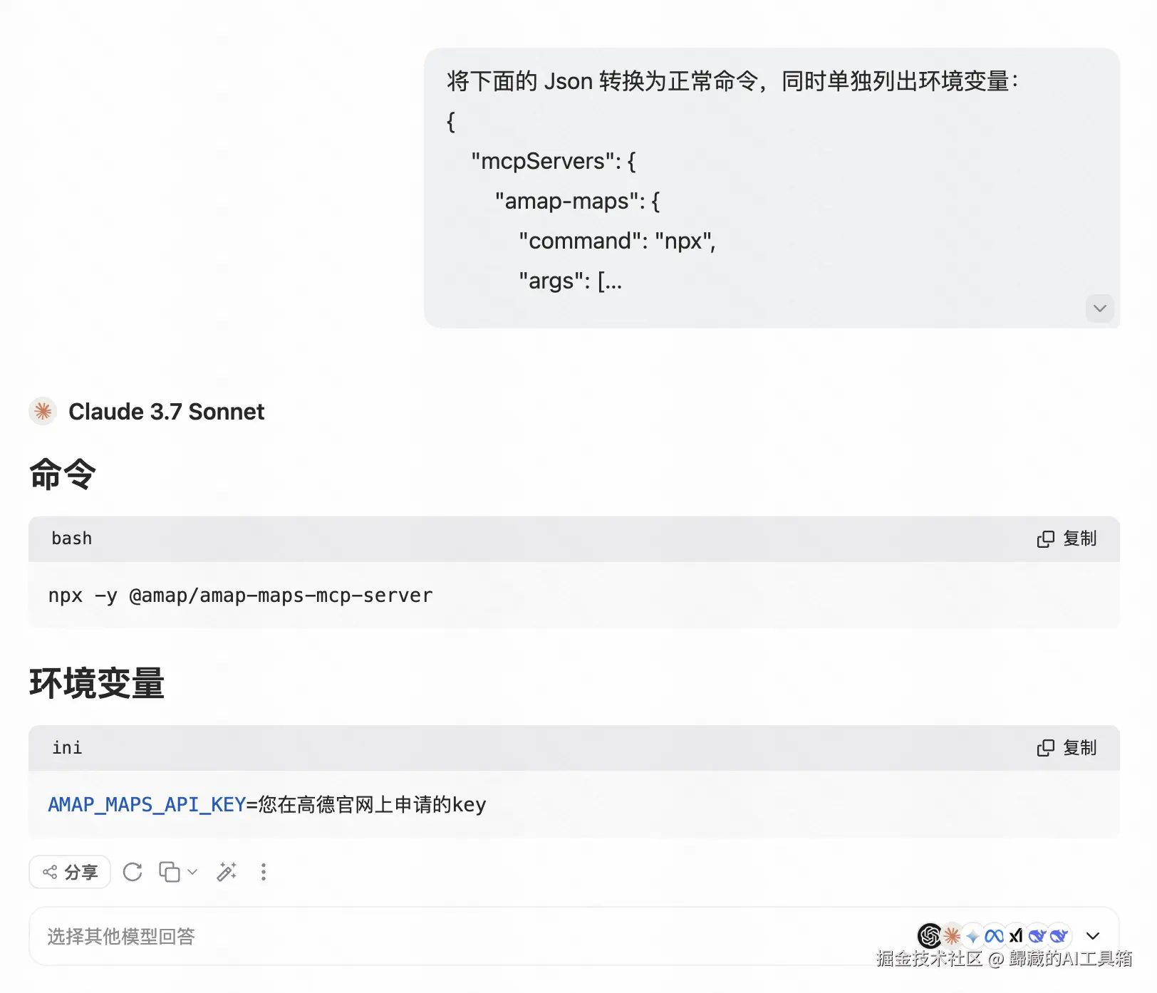 只需要将 json 代码发给 AI 模型(Claude 或者 Deepseek)然后让他将这个 Json 转换为正常的命令,同时将环境变量单列出来就行,比如下面这个高德 MCP 的 Json 就成功的分离了,我们将命令和环境变量分别填写就行。