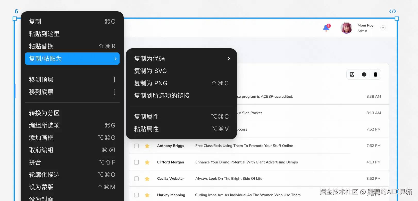 然后我们就可以在自己的 figma 设计稿里面找到一个画板然后在右键的复制里找到「复制到所选项的链接」。