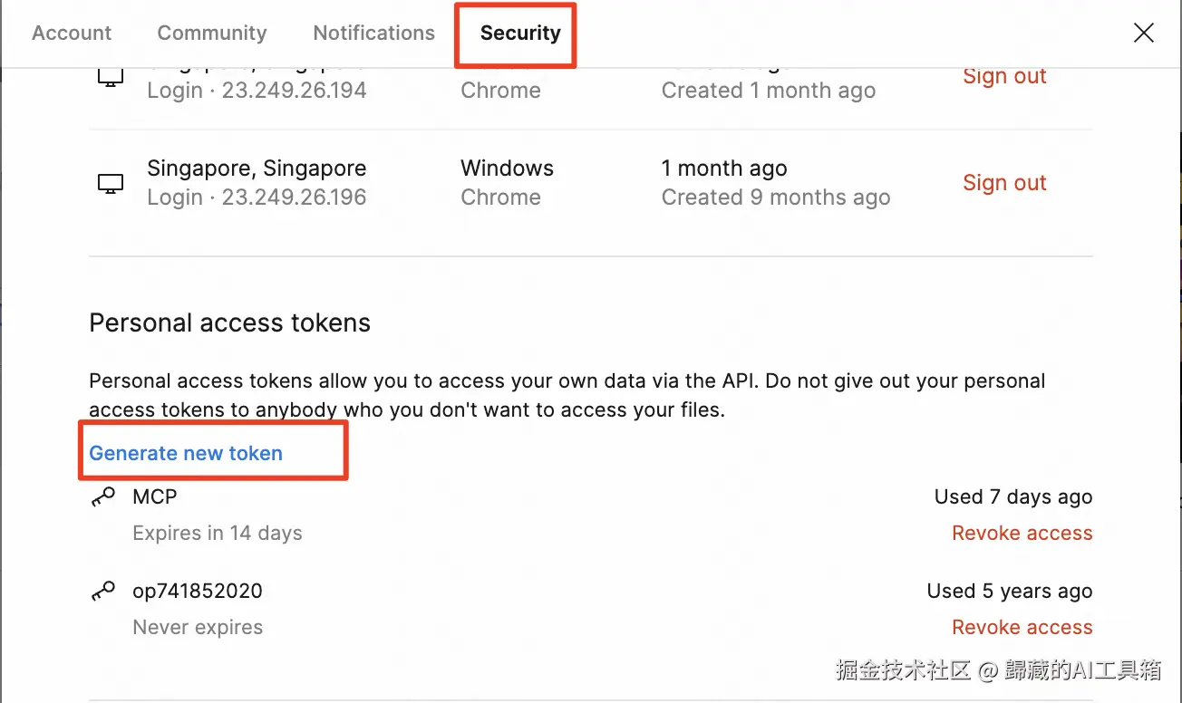 - 然后找到安全(Seccurity)选项,找到创建新的 Token(Generat new Token)
