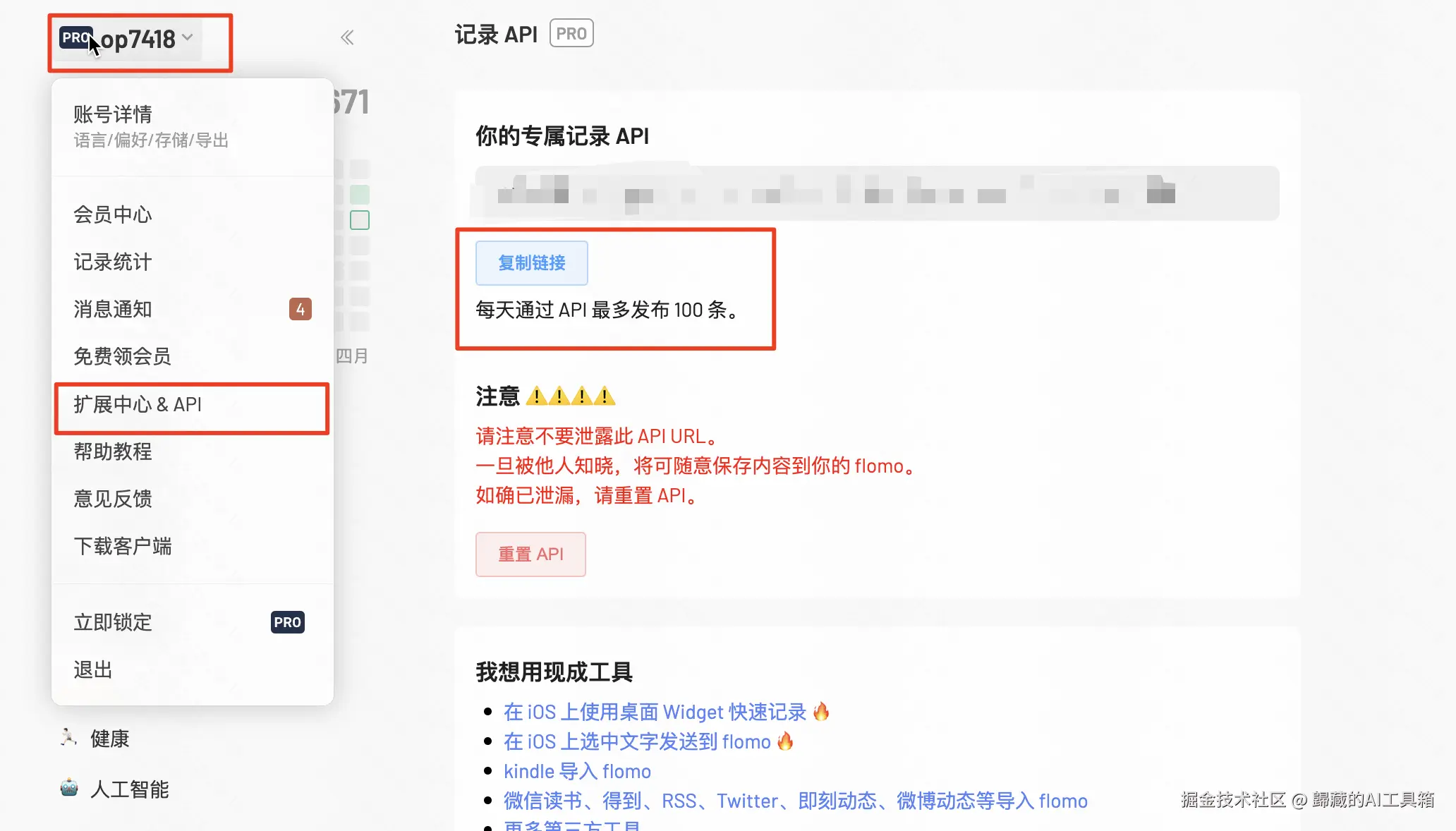我们需要提前从你的 Flomo 设置里复制你的 API 链接,准备配置的时候放到环境变量里面,直接在这个页面复制就行:v.flomoapp.com/mine?source…