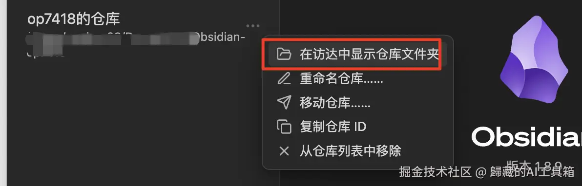 然后选择在「访达中显示仓库文件夹」,找到文件夹之后按住「Option」键右键选择复制这个文件夹的路径,记下来备用。