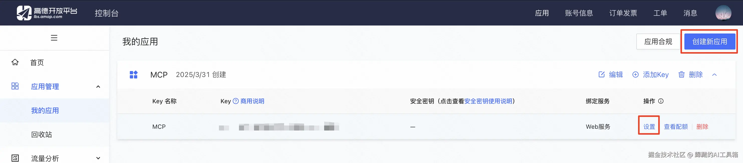 之后在控制台的「我的应用」这里创建应用就行,创建完成之后选择需要创建 Key 的应用,点击【添加 Key】,表单中的服务平台选择【Web 服务】,之后复制你的 Key 备用。