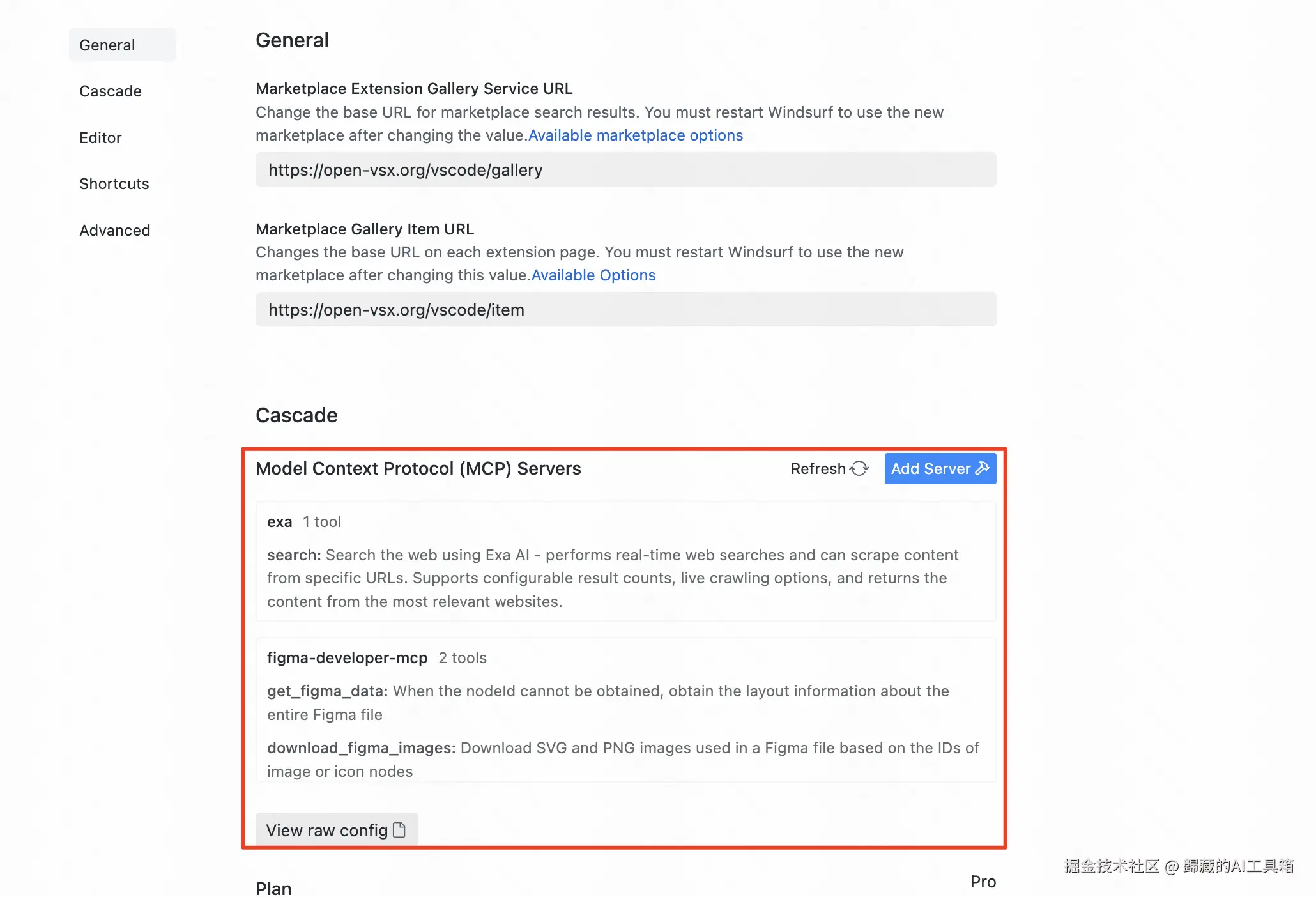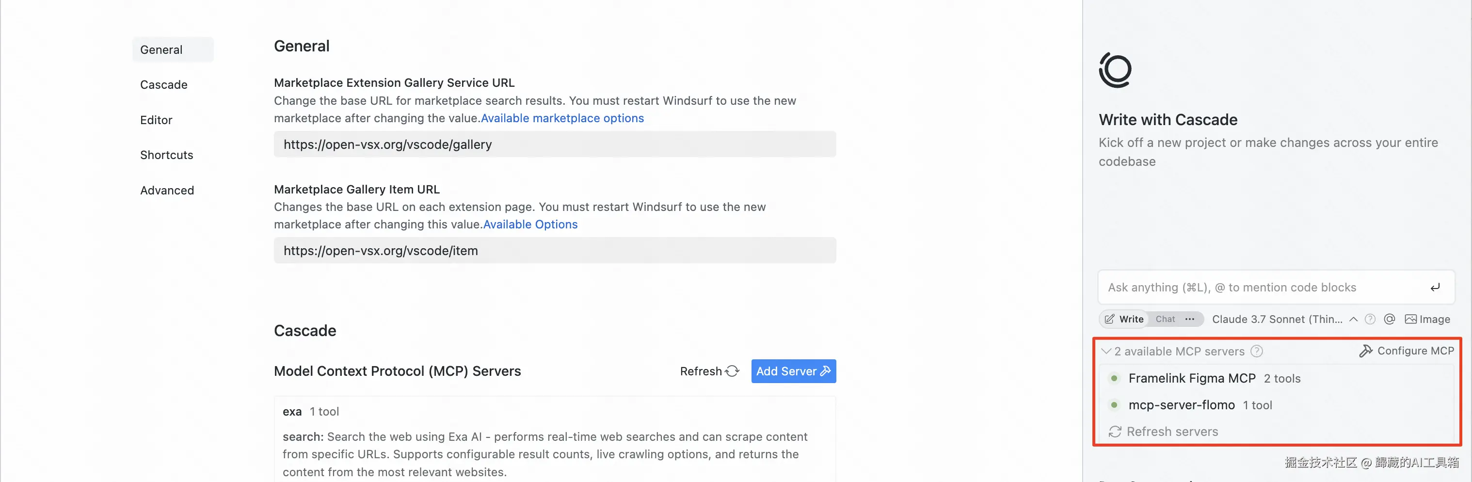 Windsurf 好的是他内置了一些常用的的 MCP 服务你可以直接用,同时由于是常见的 IDE 所以很多 MCP 网站都有适配命令很好找,上面获取 MCP 的部分我们已经说过了。