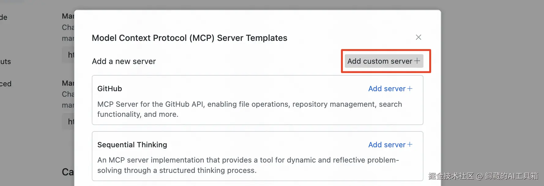 如果默认配置的没有你想要的 MCP 可以点击「Add custom sever」
