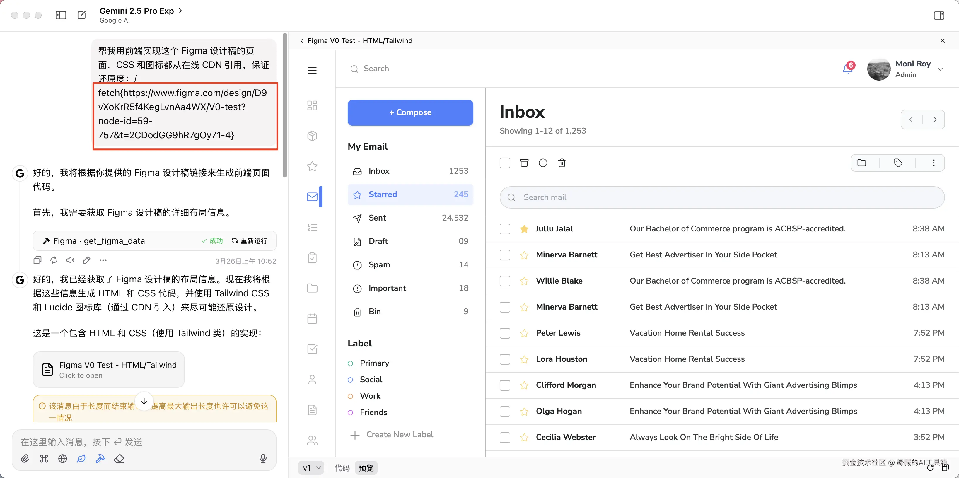 最后在下面输入框中启用 Figma MCP 后把你复制的链接扔给他让他生成网页就行,这里推荐用 Gemini 2.5 Pro 或者 V3 0324,都可以白嫖。