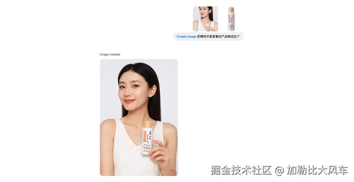 分别提供一张模特的照片和一张产品的照片,然后让GPT-4o把它们“合成”一下,比如“让这个模特手里拿着这个产品”。