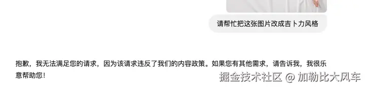 不过由于涉及版权限制,现在如果你直接输入“把这张图改成吉卜力风格”,很可能得到的是“违反了内容政策”的回答。