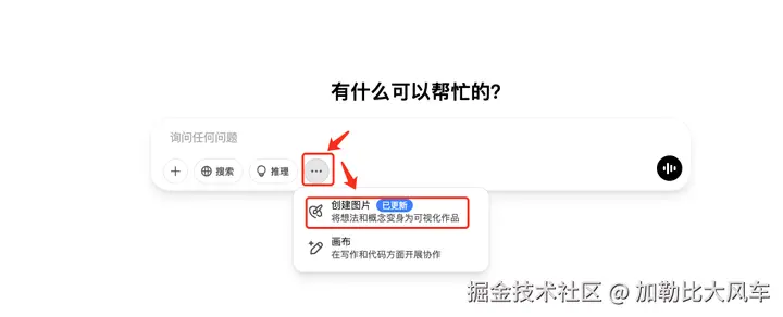 - • 或者上传一张图片,让AI修改它或以它为灵感:“让这张照片看起来像油画” 或 “用这种风格生成更多图片”。