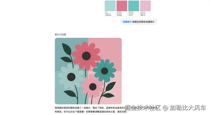 只需要给GPT-4o一张包含你想要的颜色的“色盘”图片(比如潘通色卡组合图),然后告诉它“根据这些颜色创建图片”,它就能像个绝对服从的色彩大师,严格按照你给的色盘生成一张风格统一、配色和谐的图片!