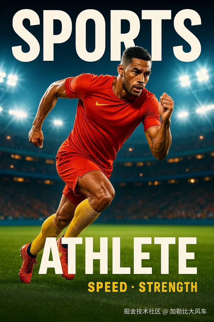 一个强大、充满活力的专业运动员在明亮的体育场场地上半运动的杂志封面。身着鲜艳的标志性运动装备,肌肉轮廓分明,专注的表情更加突出,周围环绕着戏剧性的体育场灯光。大胆的字体与充满活力、激励人心的美学相得益彰。