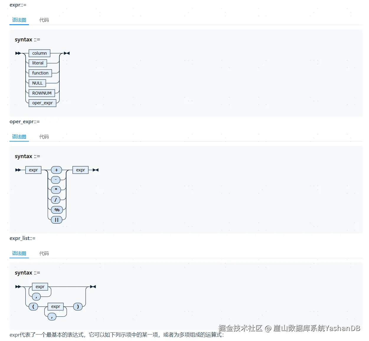 YashanDB expr语法 崖山数据库系统YashanDB 2025-04-02 78 阅读1分钟 列字段 变量、常量、字面量 函数 NULL 伪列(其中ROWID和ROWSCN只适用于HEAP表,分布式HEAP表不支持ROWID) 在YashanDB中,以下一些均为合法有效的表达式: area.area_no '34.44' SYSDATE NULL TO_NUMBER('11')%2 Copied! 几乎所有的SQL语法描述中都会使用到expr,例如,其可以参与到SQL的查询列、函数参数、WHERE条件、表达式列表(expr_list)等各种语法场景中。