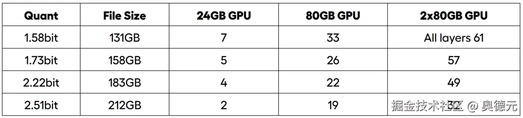 •Unsloth主页:unsloth.ai/ 采用Unsloth动态量化技术:不同于KT将不同的专家加载到CPU上,通过内存分担显存的方法保证R1 Q4KM模型运行。 技术方案是在确保模型性能的基础上,更深度的进行模型量化(最多量化到1.58Bit),并且执行不同任务时将激活的专家加载到GPU上,从而压缩模型运行所需硬件条件。 该技术能够实现单卡24G显存运行1.58bit到2.51bit的DeepSeek R1模型,并且提供了一整套动态方案,支持从单卡24G到双卡80G服务器运行动态量化的R1模型,并且对于内存和CPU没有任何要求。