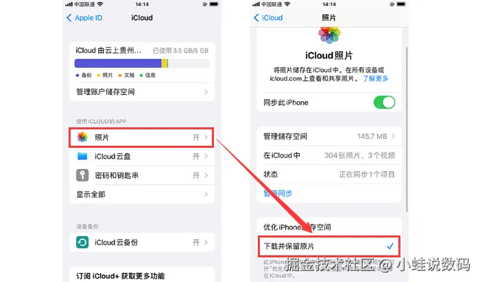 步骤2:选择 【iCloud】 ,点击 【照片】 选项,点击 【下载并保留原片】 进行恢复。
