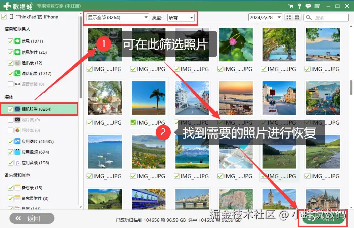 步骤2:在扫描结果中,选择 【相机胶卷】 选项并可以通过筛选器快速筛选出你误删的照片,找到需要的照片进行恢复并导出保存即可。