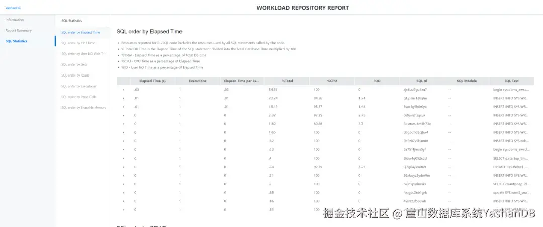 其中可以通过SYS.WRM_WR_CONTROL:查看快照保存时间跟生成间隔。通过命令可以生成如图3的AWR报告,报告包含中数据库信息,快照信息,等待事件、多维度统计慢SQL语句。