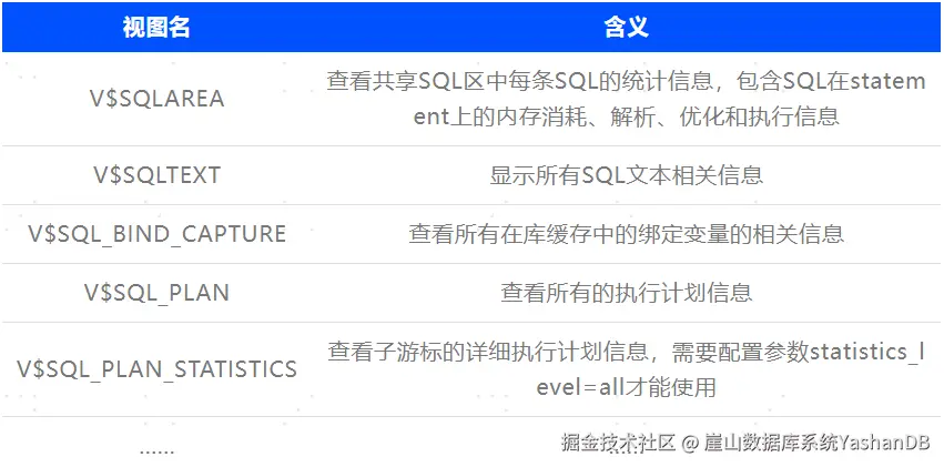 YashanDB数据库中,有大量SQL相关视图来记录SQL语句的相关信息,如表1所示,列出部分相关SQL视图: