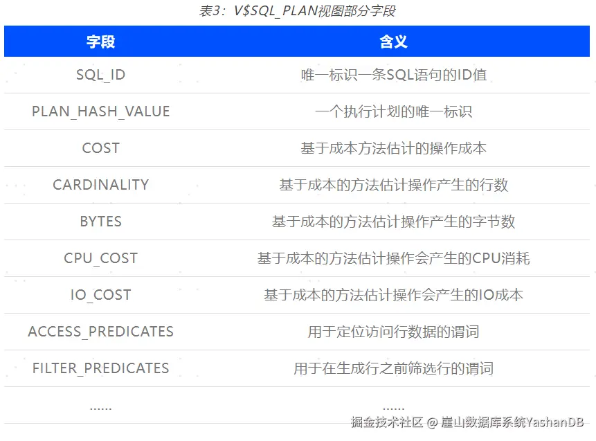 执行计划可用于分析慢SQL,SQL视图也能查询慢SQL语句当时的执行计划。YashanDB的SQL_PLAN视图可用于慢SQL执行计划查询,该视图的部分字段如表3所示:
